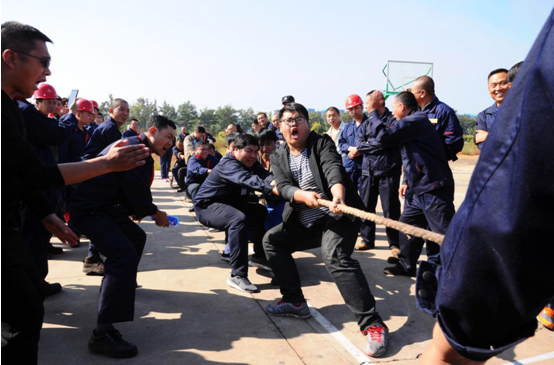 比賽場(chǎng)地設(shè)在辦公樓門前停車場(chǎng)。由各車間為單位,組成的12支代表隊(duì)參加了比賽,其中男隊(duì)8支女隊(duì)4支。比賽采用三局二勝制淘汰賽,每隊(duì)參賽人員 10人,按抽簽分組決定比賽順序。參賽隊(duì)員們個(gè)個(gè)摩拳擦掌、士氣高昂,隨著裁判員一聲哨響,比賽正式開始。隊(duì)與隊(duì)之間是一場(chǎng)力量和技術(shù)的較量,上場(chǎng)的兩支參賽隊(duì)伍緊握拔河繩,心往一處想,勁往一處使,拼勁全力,展開了實(shí)力拉鋸戰(zhàn)。賽場(chǎng)下,啦啦隊(duì)員們?yōu)樽约褐С值年?duì)伍加油鼓勁,助威聲一浪高過一浪。隊(duì)員們?cè)谫悎?chǎng)上的精彩表現(xiàn)搏得了現(xiàn)場(chǎng)觀眾的陣陣歡呼,號(hào)子聲、吶喊聲,此起彼伏,高潮迭起,氣氛熱烈。